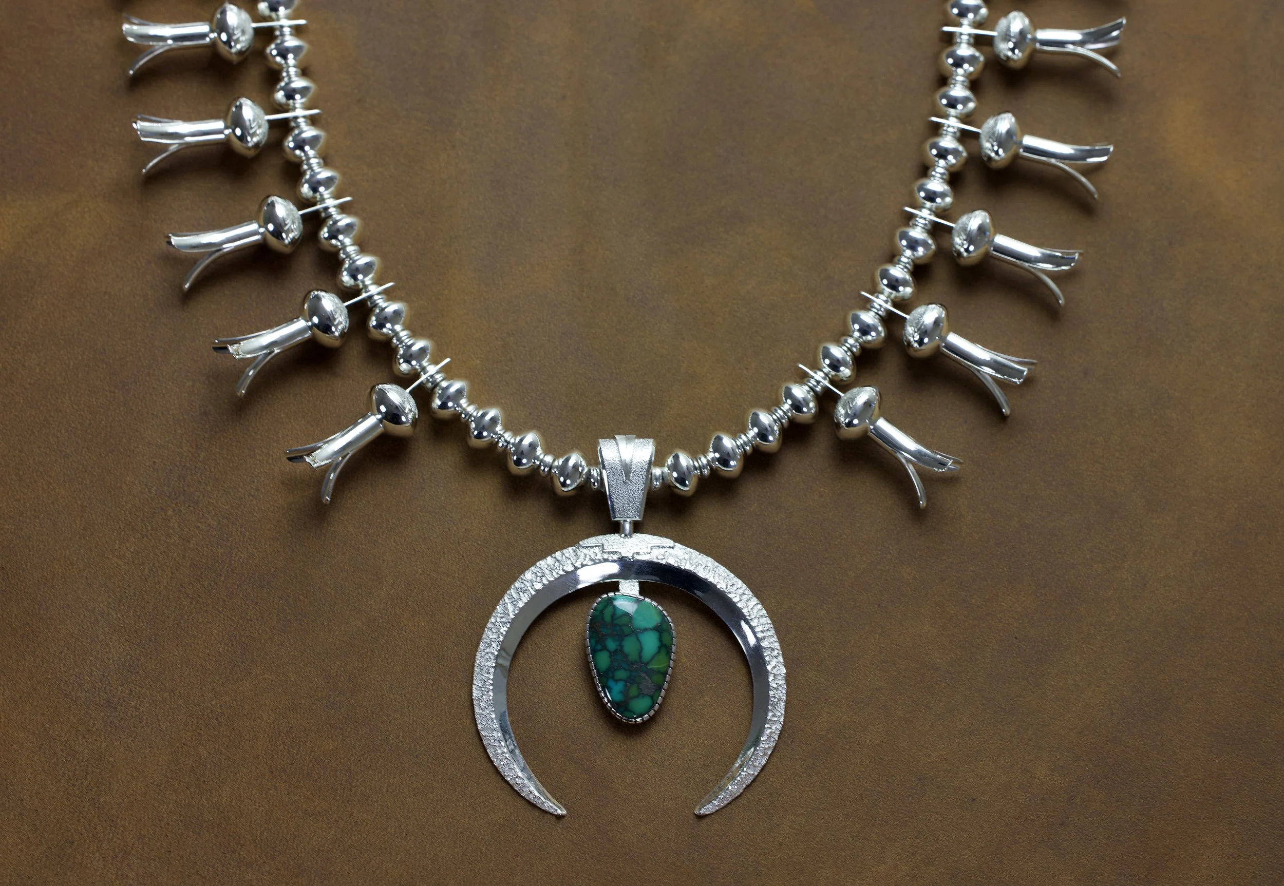 Sterling Silver Traditional Dinè Squash Blossom feat. Vintage Spider Web Fox Turquoise